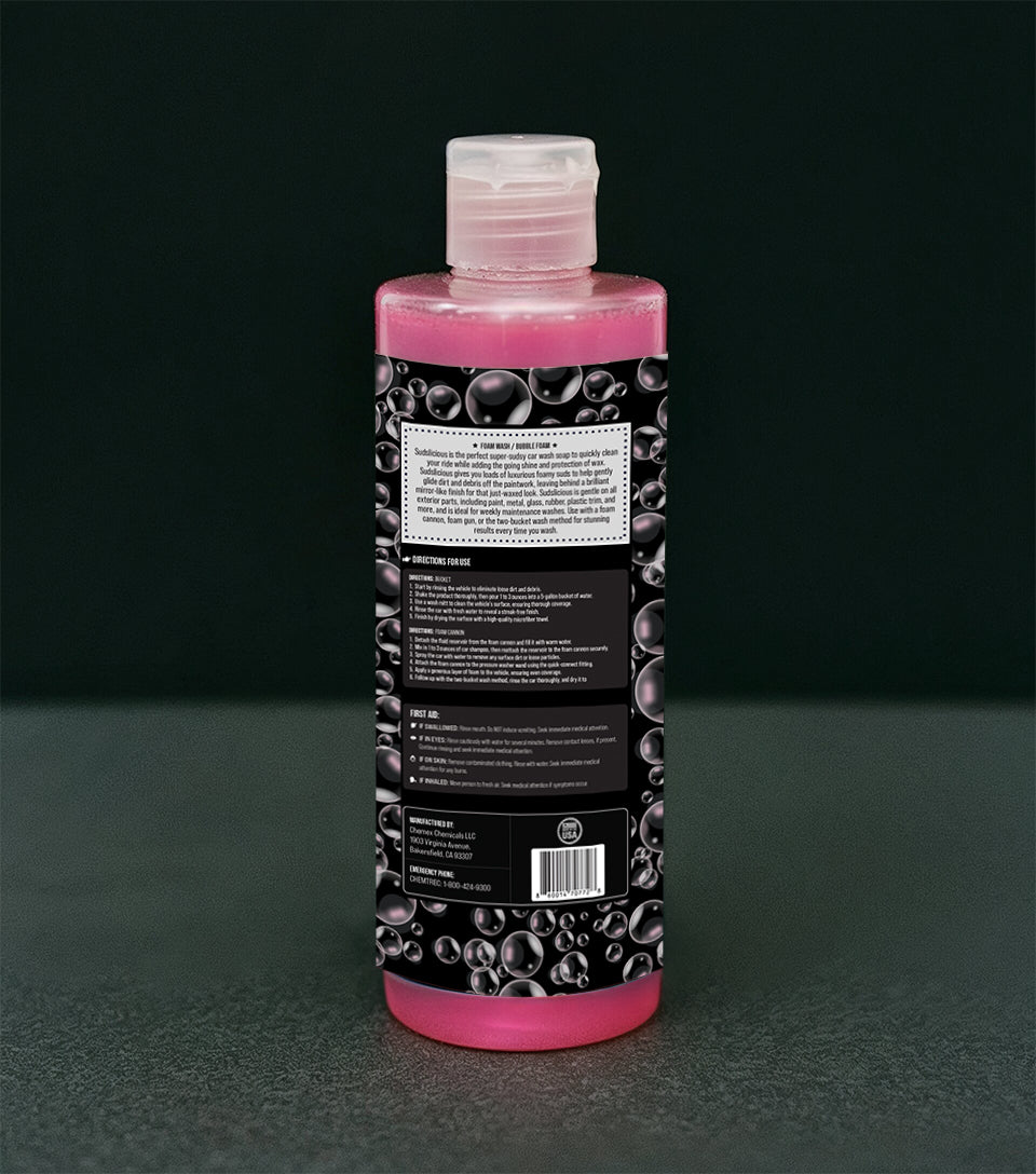 Sudslicious is the perfect super-sudsy car wash soap to quickly clean your ride while adding the going shine and protection of wax. Sudslicious gives you loads of luxurious foamy suds to help gently glide dirt and debris off the paintwork, leaving behind a brilliant mirror-like finish for that just-waxed look. Sudslicious is gentle on all exterior parts, including paint, metal, glass, rubber, plastic trim, and more, and is ideal for weekly maintenance washes. Use with a foam cannon, foam gun, or the two-bucket wash method for stunning results every time you wash.